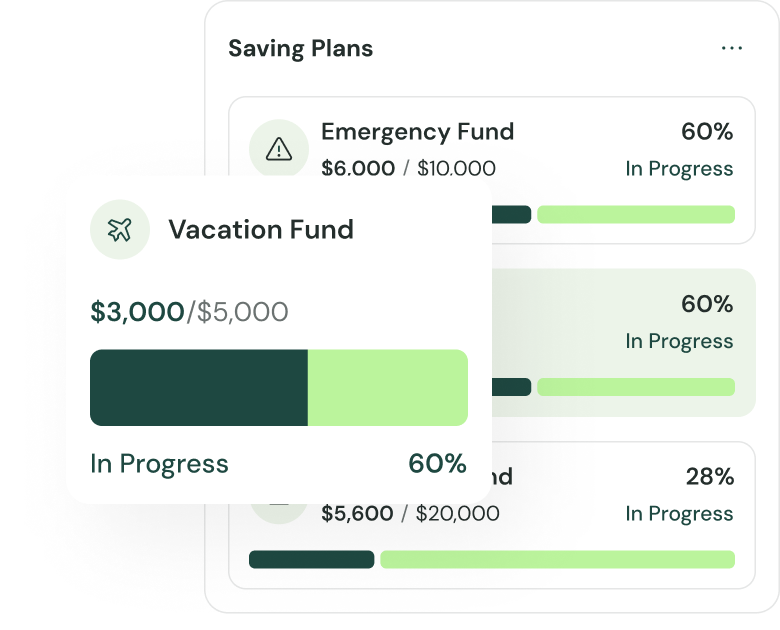 Set personalized savings goals—whether it’s for an emergency fund, vacation, or new home—and watch your progress grow with smart nudges and auto-savings options.